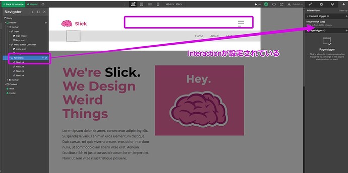 showcaseの「FREEBIE: Slick Template( Webflow ) 」を参考に勉強しているのですが、ハンバーガーメニューがどうして動いているのか、webflowの中味を見てもわかりません。いろいろな箇所を見ているのですが、ハンバーガーメニューをクリックした際の挙動がどこにも見つからないのです。