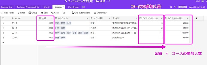 Lesson tableに参加する人数 と、合計フィールドするフィールドを作れば良いと思います。