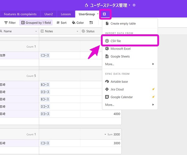 Dスタジオごとの売上がこれです。このスタジオの売上の内訳はこのユーザーたちですよ、とかがわかるように設定したいです。Usertableというのは1つのテーブル(ファイル)全体のことを指していますか?GroupでNameで括るという設定はどこで行うのでしょうか?