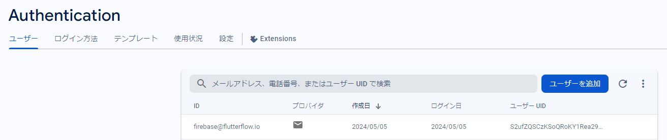 ①FirebaseのAuthenticationの画面上で、一旦firebase@flutterflow.ioアカウントを削除します。